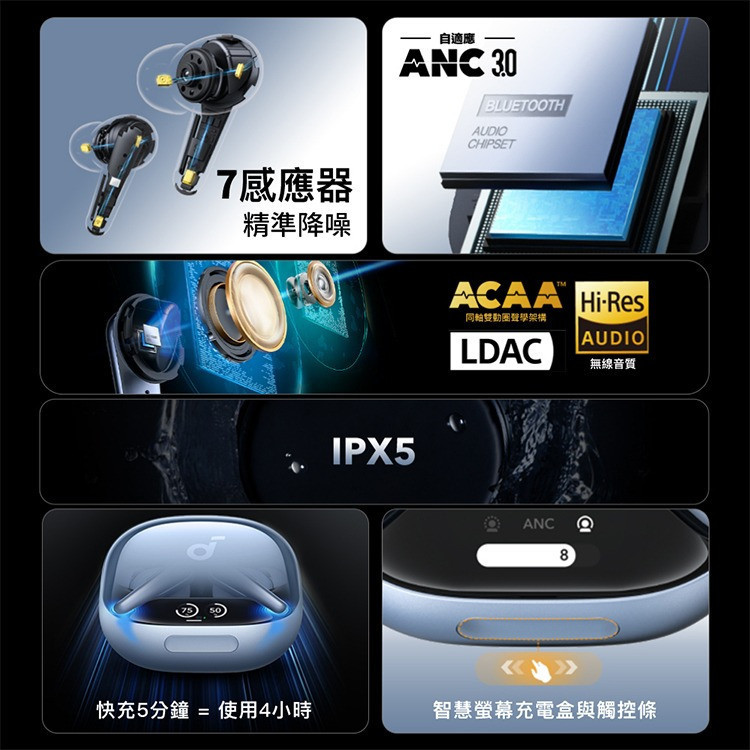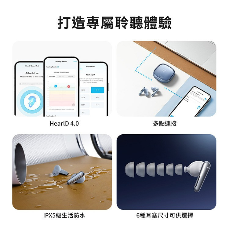 ‧雙耳搭載 6 個聲音感應器,從各角度精準捕捉並消除噪音,為 soundcore 歷來最強大的降噪耳機