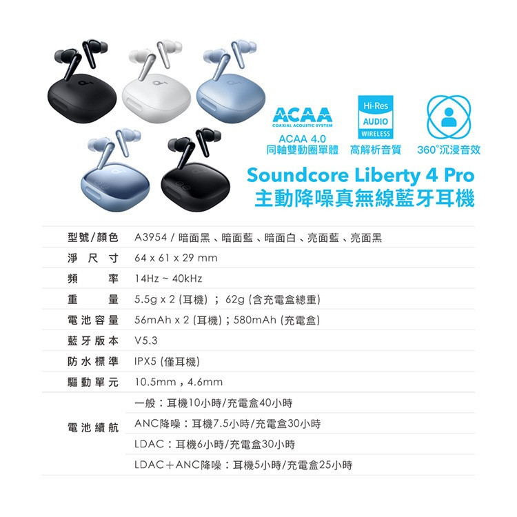 – LDAC+ANC降噪:耳機5小時/充電盒25小時