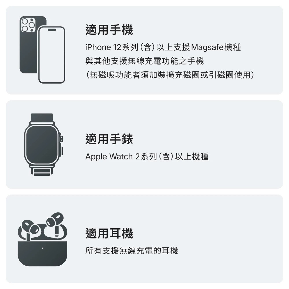 適用手機型號 :iPhone 12系列(含)以上支援Magsafe機種與其他支援無線充電功能之手機(無磁吸功能者須加裝擴充磁圈或引磁圈使用)