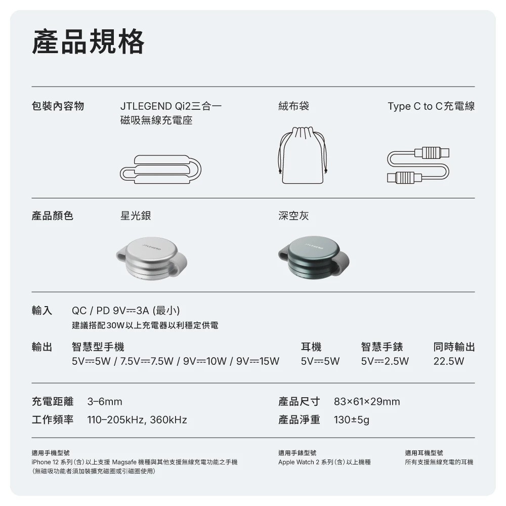 ∙ JTLEGEND Qi2三合一磁吸無線充電座