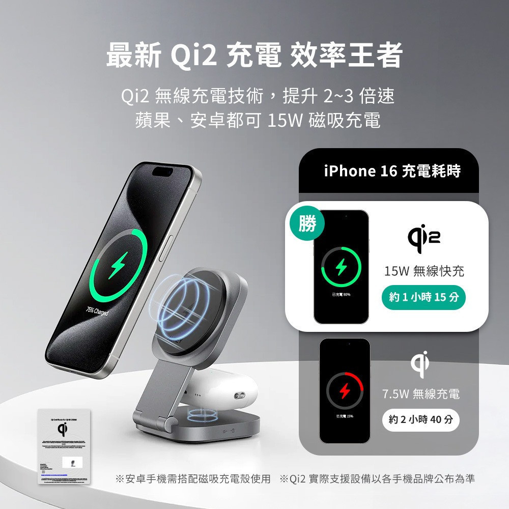 支援最新 Qi2 無線充電標準,相容多種 Qi 裝置,充電更快更安全